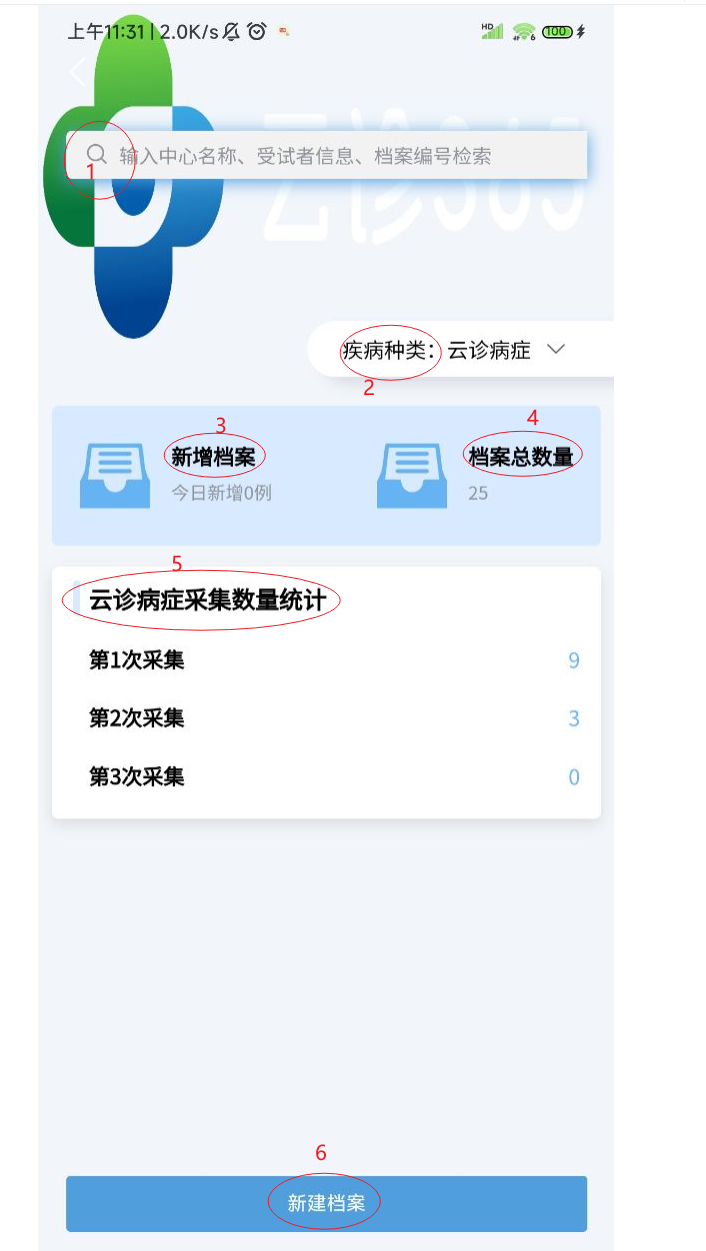 在app科研系统首页,管理员可以1.查询档案、2.选择病种,根据不同的病种可以查看3.新增档案数、4.档案总数量、5.采集统计数量、6.新建档案。