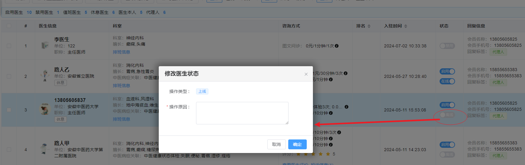 9.1 在医生列表页面,可以设置医生在线或离线,离线状态的医生在app名医咨询中显示离线。