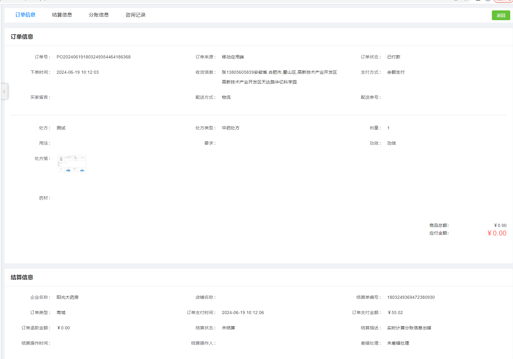 在处方订单页面,点击【订单号】可以查看订单信息,结算信息,分账信息及咨询记录信息。