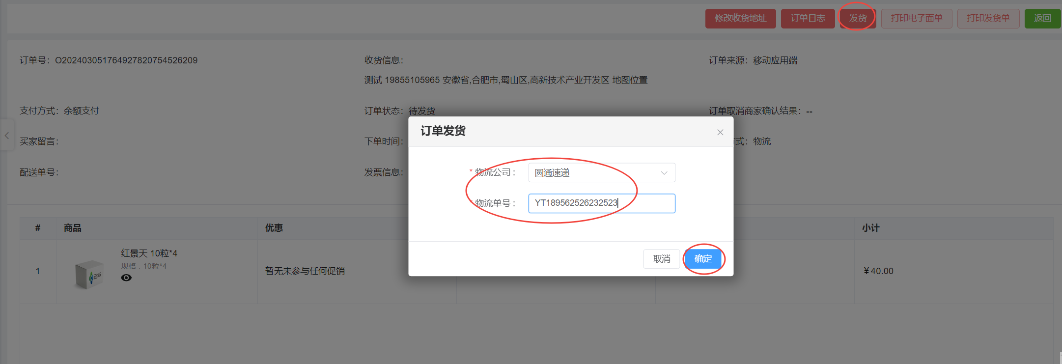 选择待发货订单点击【查看】进入订单详情页点击【发货】按钮,弹出页面选择物流公司和物流单号。