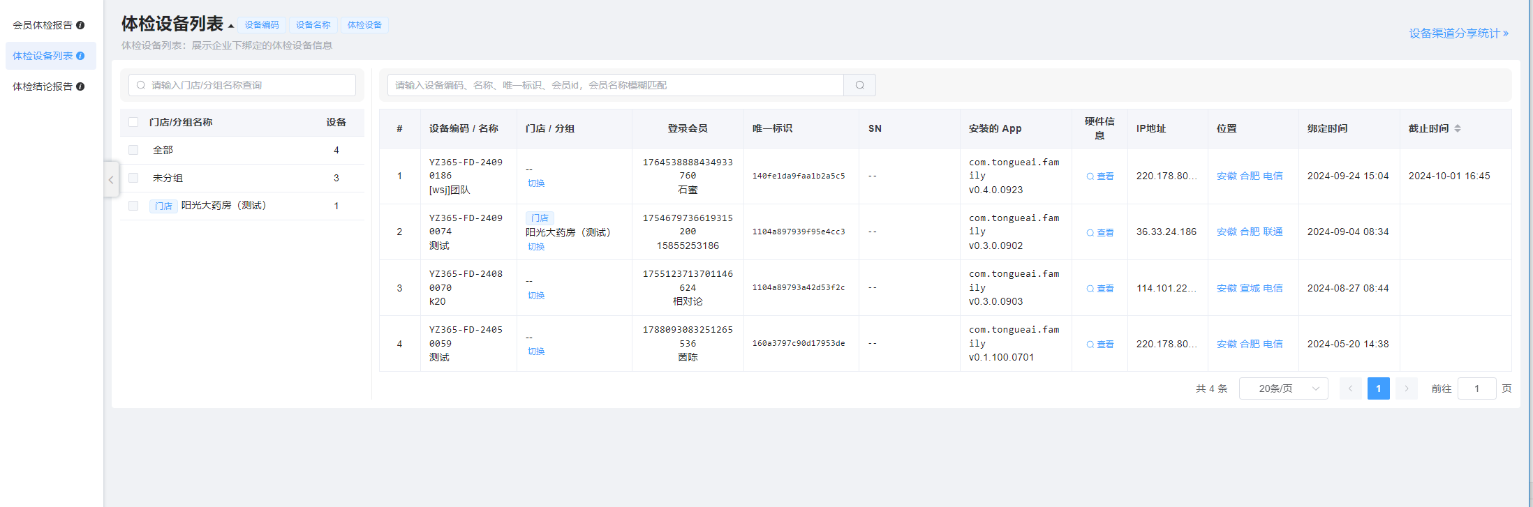 企业可以在本模块查看本企业绑定的体检设备信息及登录会员信息,可检索,可以切换设备分组。